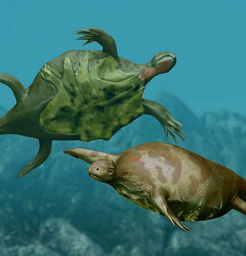 オドントケリスは平べったい体をしていて、おなか側には肋骨が変形した甲羅がありました。しかし背中側に甲羅が無かったのです。